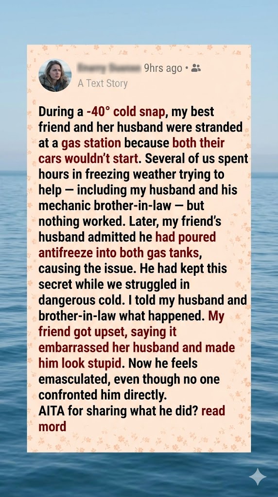 Yesterday I (36 F) got a frantic call from my best friend (36 F). She says that both she and her husband (35 M) were stuck at the gas station because both cars wont start. While this sounds unrealistic to some, this is in a northern state during an arctic blast of -40° cold front. Batteries stop working in that kind of cold. My friend tells me that her husband called her to come give him a jump, and when she got there and tried to jump his car, hers suddenly shut off and then wouldn’t start.
