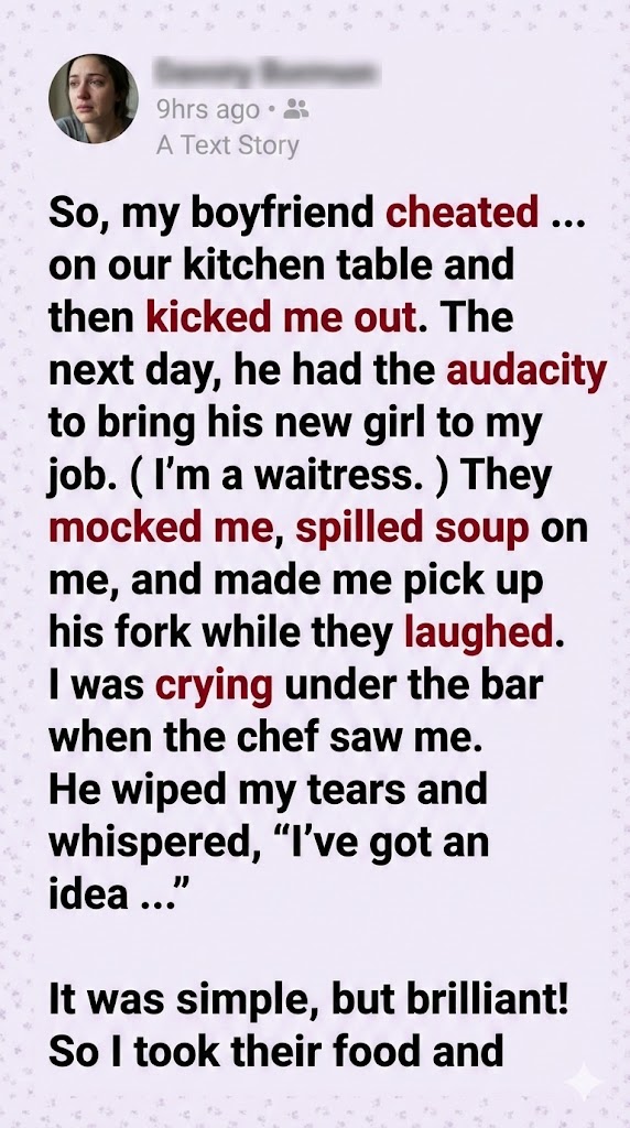 The entire restaurant, including the regulars who had watched them bully me, erupted in laughter. The girl bolted for the bathroom to vomit, and my ex ran out the front door, knocking over a chair in his blind panic.