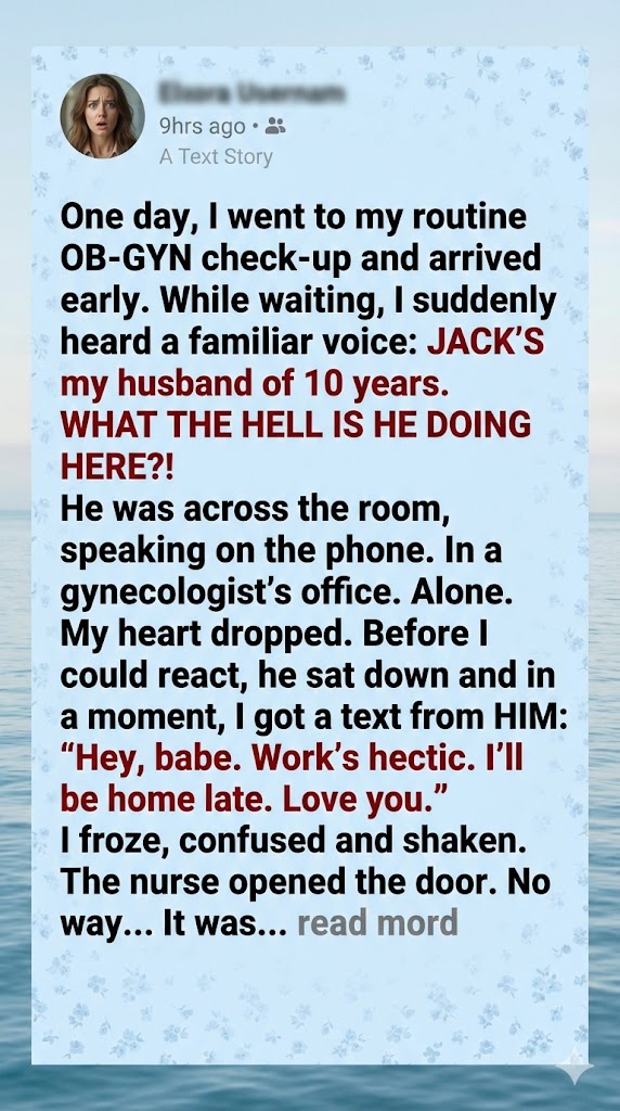 I was in the hospital waiting room for my annual OB-GYN checkup when I heard a familiar voice. My heart froze. Just a few seats away sat my husband, Jack, speaking quietly on his phone. What was he doing there?