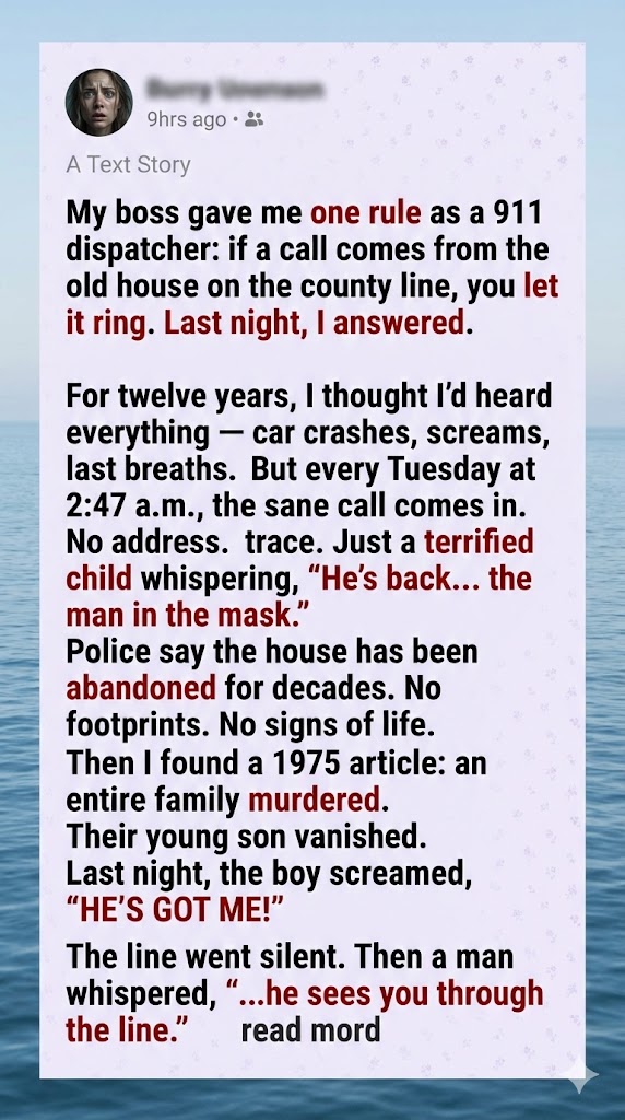 I’ve been a 911 dispatcher for twelve years, the last seven on the graveyard shift. You think you’ve heard it all after that long. The drunks, the domestics, the panicked fumbling for words after a car crash. It all becomes a kind of white noise, a rhythm of human misery you learn to navigate without letting it touch you. You have to. It’s the only way to stay sane.