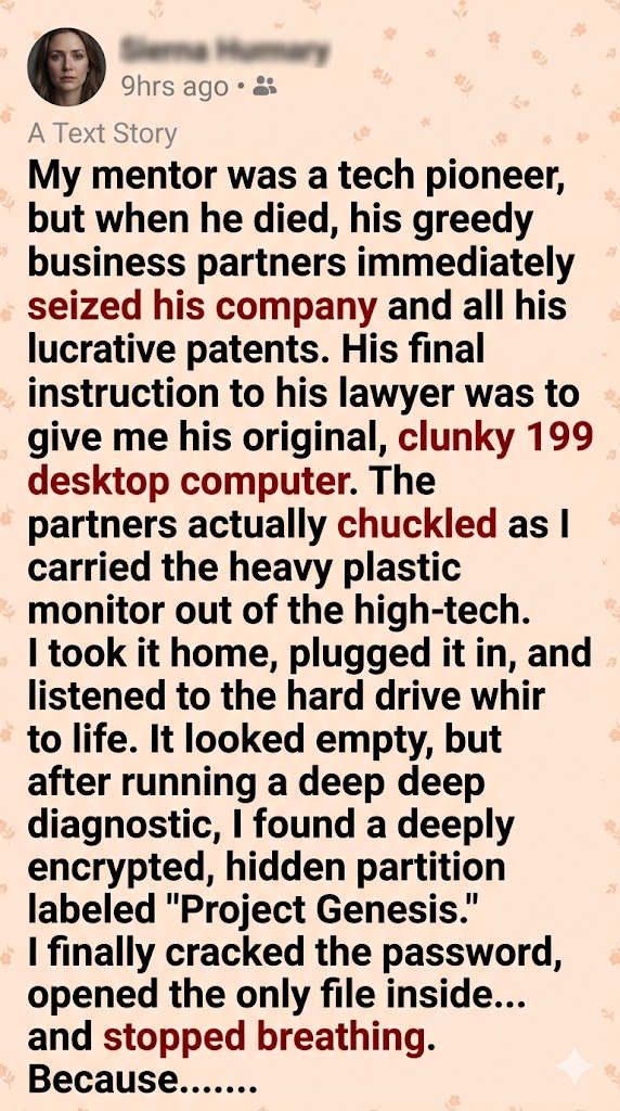 What they didn’t know—what nobody knew—was that Arthur never built the Nexus AI on their shiny silicon servers. He built its foundational architecture in 1998, on this exact machine. And he had hardcoded the ultimate backdoor into the framework itself. Every line of code written over the last twenty-five years, every update, every patent they just stole, was layered on top of a core protocol that only recognized this single, obsolete desktop as its absolute master.