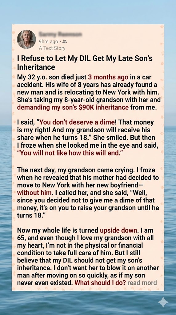 When my son passed away unexpectedly, my world shattered. He was my only child, and losing him felt like losing my future. Amid the grief, I faced another heartbreak—his widow, my daughter-in-law, immediately began asking about his inheritance. She didn’t shed a tear, didn’t ask how I was coping. Just money. I was stunned.
