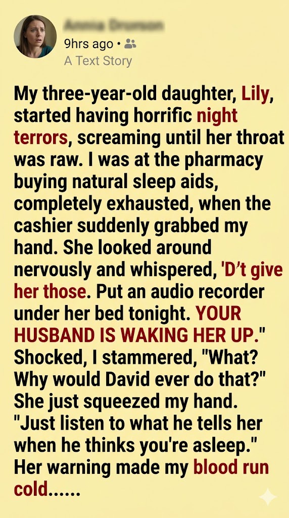 The drive home from the pharmacy was a blur. The cashier’s terrified eyes and desperate grip on my hand haunted my every thought. Your husband is waking her up. It made no sense. David was the doting father. Whenever Lily’s blood-curdling screams pierced the night, he was always the first one out of bed, rushing to her room to soothe her while I trailed behind, groggy and guilt-ridden. He was her protector. But as I pulled into our driveway, a dark, suffocating seed of doubt took root in my chest.