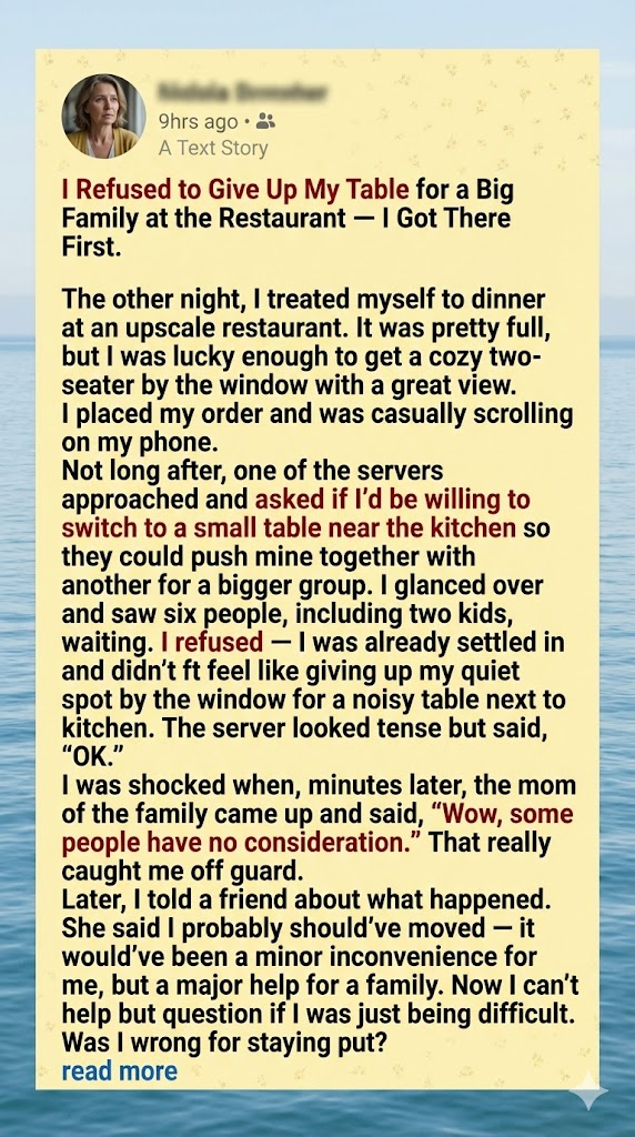Reddit commenters weighed in, many sharing support for me. A former restaurant manager pointed out the staff should’ve offered something for my trouble—like a free drink or dessert—and left the decision to me, not pressured me. Others emphasized the first-come, first-served rule—no one should be asked to yield their table absent reservation protocol.