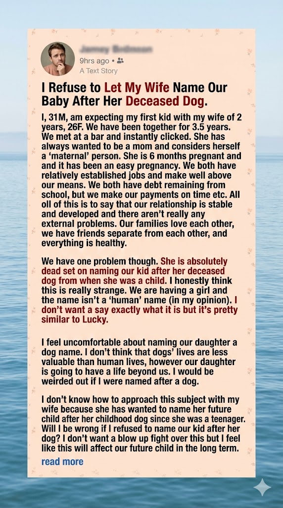 Reddit users flooded the post with opinions. Many supported the husband’s stance, arguing that naming a child should be a mutual decision and that “names are always two yeses, one no.” Others questioned why such a significant naming preference hadn’t come up earlier in the relationship. Some pointed out that while honoring a pet is sweet, it shouldn’t override the child’s future well-being.