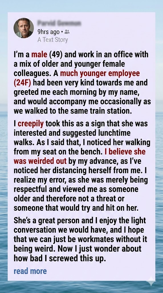 I work in an office with a mix of ages, and at 49, I’m one of the older ones. There’s a younger colleague—24, bright, kind—who used to greet me warmly each morning, always by name. Sometimes we’d walk to the train station together, just light conversation, nothing deep. I took it as friendliness, but somewhere along the way, I misread it. I thought maybe she was interested. So I suggested we take lunchtime walks. As soon as I said it, I saw her shift—literally. She stood up from the bench and walked away. That moment still plays in my head.