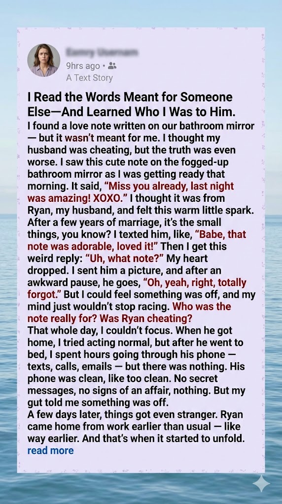Madison thought it was just another ordinary morning—until she saw the note. Scribbled on a fogged-up bathroom mirror, a Post-it glowed with affection: “Miss you already, last night was amazing! XOXO.” Her heart fluttered. After years of marriage, small gestures like this felt like rare gems. She smiled, assuming her husband Ryan had left it after their dinner date the night before.