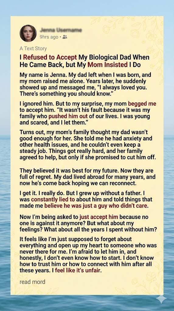Still, I understood something deeper: my refusal wasn’t just about him. It was about protecting the life I’d fought to build. My mother’s insistence came from hope, but mine came from truth. Some wounds don’t need reopening. Some stories don’t need rewriting.