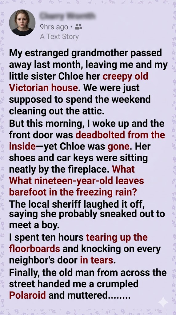 I stared at the photograph, the icy rain soaking through my thin sweater. The Polaroid was faded, its edges yellowed with age, but the image was terrifyingly clear. It was a picture of our grandmother’s parlor, taken decades ago. The room was empty, but perfectly embedded into the intricate, winding floral pattern of the Victorian wallpaper was the agonizing, unmistakable face of a young woman, her mouth stretched in a silent scream.