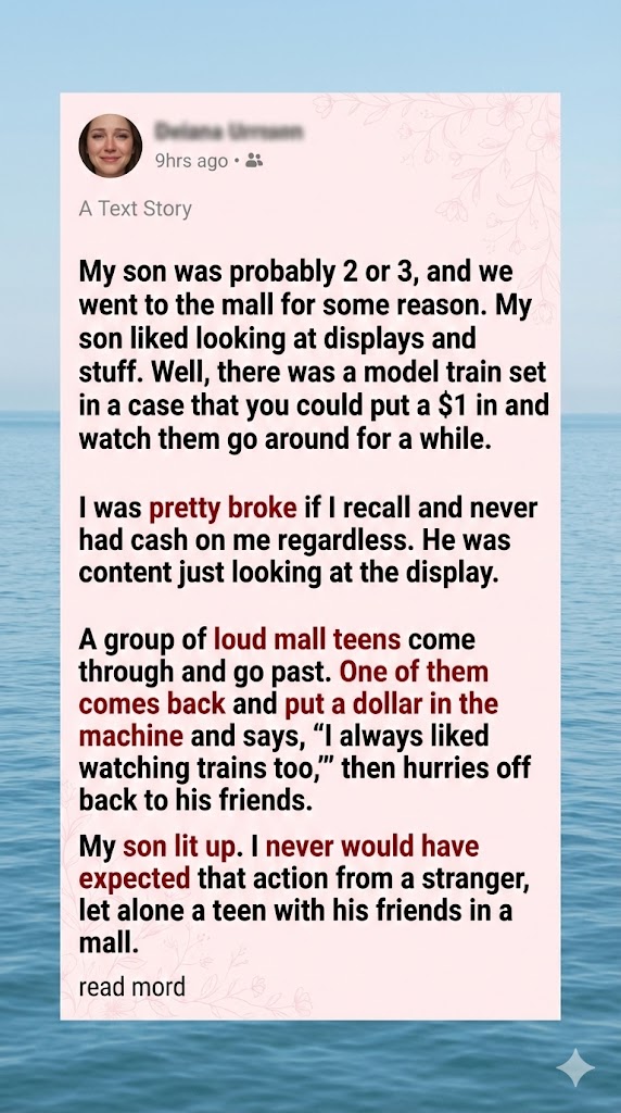 At a quiet mall on an ordinary afternoon, a young mother wandered with her toddler son, who was about two or three. He loved looking at displays, and one in particular caught his eye—a model train set behind glass. For a dollar, the trains would run in circles, whistling and chugging. She didn’t have the cash, and her son didn’t ask. He was content just watching, his little face pressed to the glass.