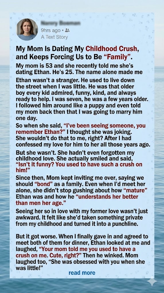I’m 25, and my mom recently started dating someone new—Jake, who just happens to be my childhood crush. I used to doodle his name in notebooks and blush when he passed by. He’s only five years older than me, and now he’s sitting at our dinner table, holding my mom’s hand. I thought it was a joke at first. But she’s serious. She keeps saying, “Isn’t it funny how life works?” No, Mom—it’s not funny. It’s awkward, confusing, and borderline humiliating. I can’t look at him without remembering teenage fantasies—and now he’s calling her “babe.”
