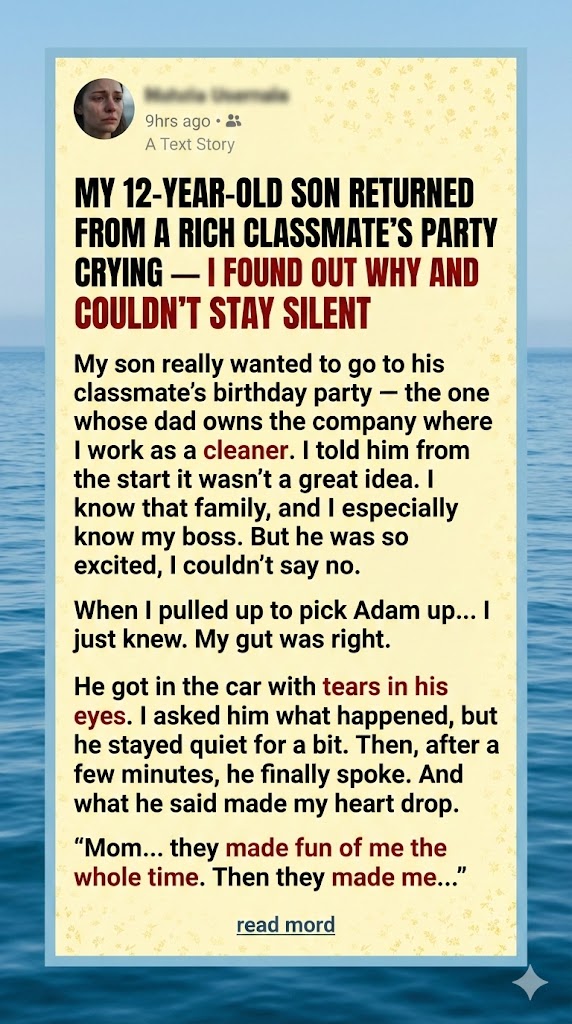I dropped him off at a mansion that looked like another planet. Hours later, when he slid back into the car, the boy I knew was gone. He was compressed into himself, a wounded animal. The silence was suffocating. Finally, he broke. Through streaming tears, he whispered the truth: “They made fun of me, Mom. They said I was just like you. A cleaner.”