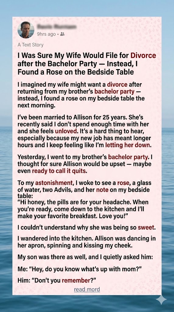 On the bedside table sat a single rose. Beside it, two Advil, a glass of water, and a handwritten note: “Hi honey, the pills are for your headache. When you’re ready, come down to the kitchen and I’ll fix your favorite breakfast. Love you!”