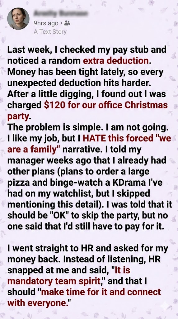 I drafted an email to HR, CC’ing my manager and—just for good measure—the Director of Operations. I attached a screenshot of my pay stub and a link to the Department of Labor’s statutes regarding “unauthorized wage deductions.” I kept it professional but icy. I wrote: “I did not authorize this deduction in writing. Furthermore, requiring an employee to pay for a social event, particularly one they have already declined to attend, is a violation of labor laws. Please remit the $120 immediately to avoid me escalating this claim formally with the Labor Board.”