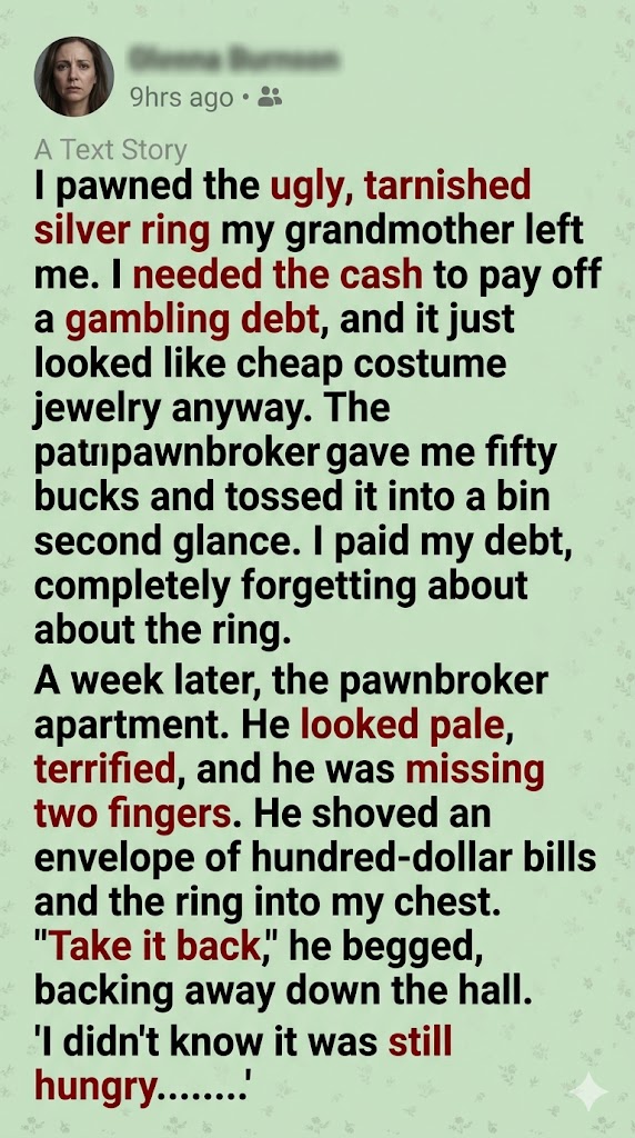 I looked at the ten thousand dollars on the table. It wasn’t a refund. It was blood money. The pawnbroker hadn’t been paying me back; he had been paying a ransom to the thing on my finger so it would let him go. He’d given it two fingers just to buy enough time to reach my door.