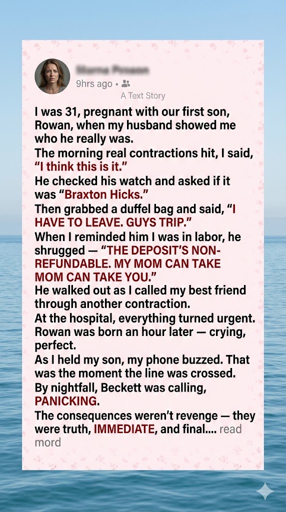 “Text me your contraction times,” she said. Her voice went flat and focused. “I’m leaving work right now. Do not drive. Do not wait for his mother.”