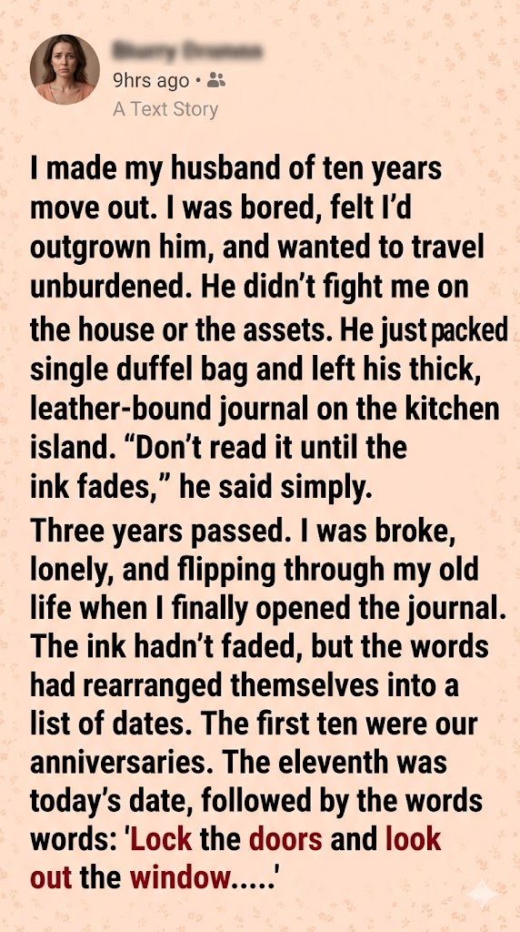 I made my husband of ten years move out. I was bored, felt I’d outgrown him, and wanted to travel unburdened. He didn’t fight me on the house or the assets. He just packed a single duffel bag and left his thick, leather-bound journal on the kitchen island.