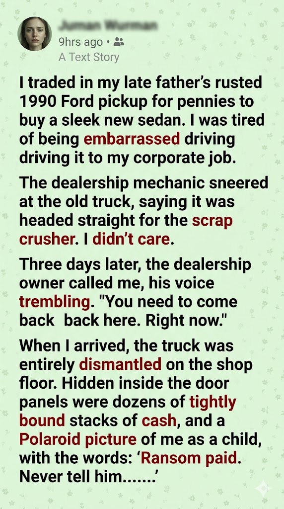 I had spent my entire adult life trying to outrun the shame of his poverty. I bought tailored suits, worked eighty-hour weeks at a glass-and-steel corporate firm, and traded in the only thing he left me for a sleek, soulless sedan just so my coworkers wouldn’t judge me in the parking garage.