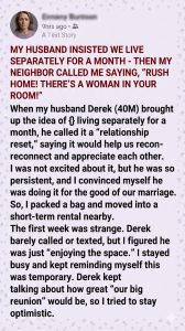 The pieces clicked into place. The “relationship reset.” The one-month timeline. The “enjoying the space.” He wasn’t trying to fix our marriage; he was test-driving a new life with a new woman to see if she was worth divorcing me for. If it didn’t work out with her, he would have just welcomed me back for our “big reunion” like nothing happened.