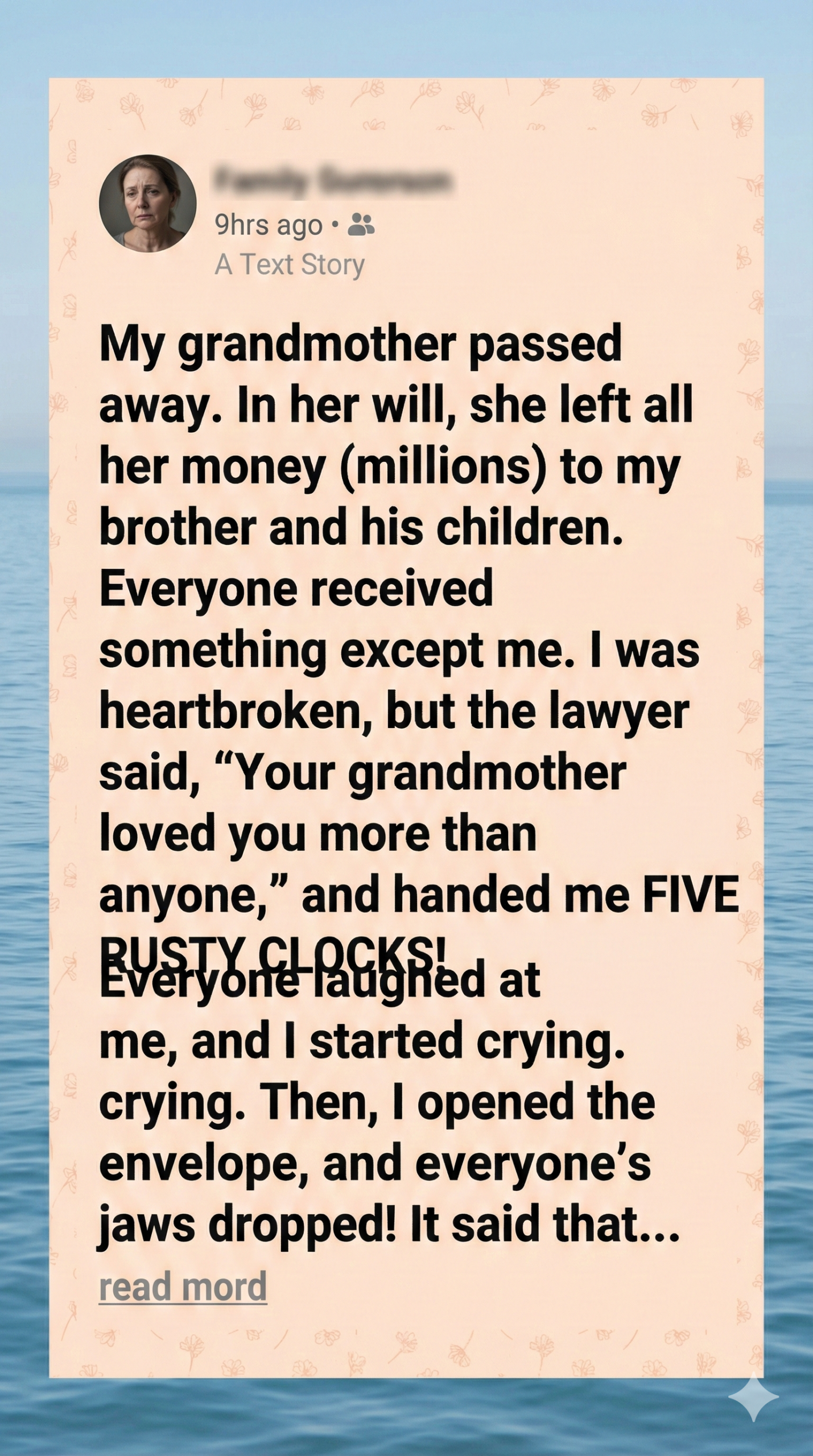 My grandmother passed away quietly in her sleep at the age of ninety-three. She had always been the strong one in our family — sharp-minded, independent, and strangely obsessed with old clocks. Every room in her house ticked with a different rhythm.