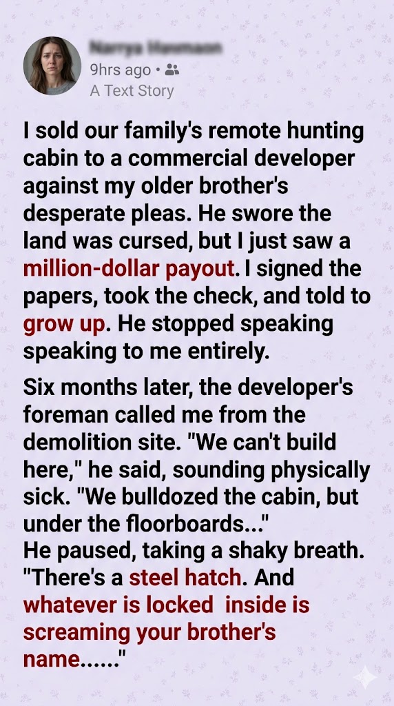 When I pulled up to the clearing, the site was entirely abandoned. Half-eaten sandwiches sat on the hoods of bulldozers. The cabin was gone, reduced to a massive pile of splintered pine and shattered glass. But in the center of the bulldozed earth, the soil had been scraped away to reveal a slab of poured concrete, older than the cabin itself.