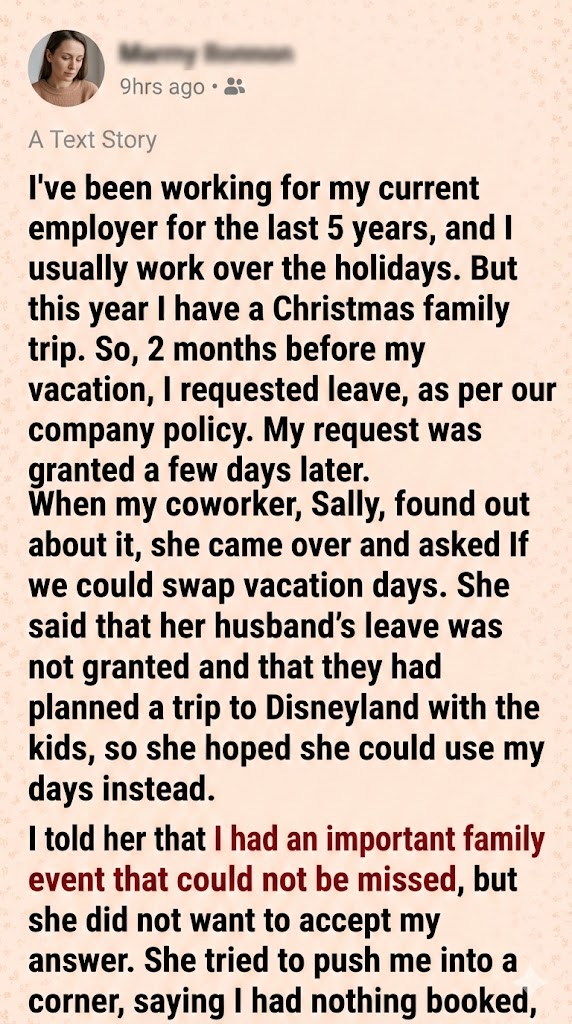 I explained the situation—that I had requested my leave well in advance as per policy, and that I was now being harassed and guilt-tripped to give it up because of someone else’s lack of planning. Thankfully, my manager, who values the fact that I’ve covered holidays for the past five years, shut it down immediately. He called Sally in and told her explicitly that the schedule was set, my leave was approved, and that harassment regarding the schedule would not be tolerated. He reminded her that she had waited until the last minute to request dates that were already blocked out.