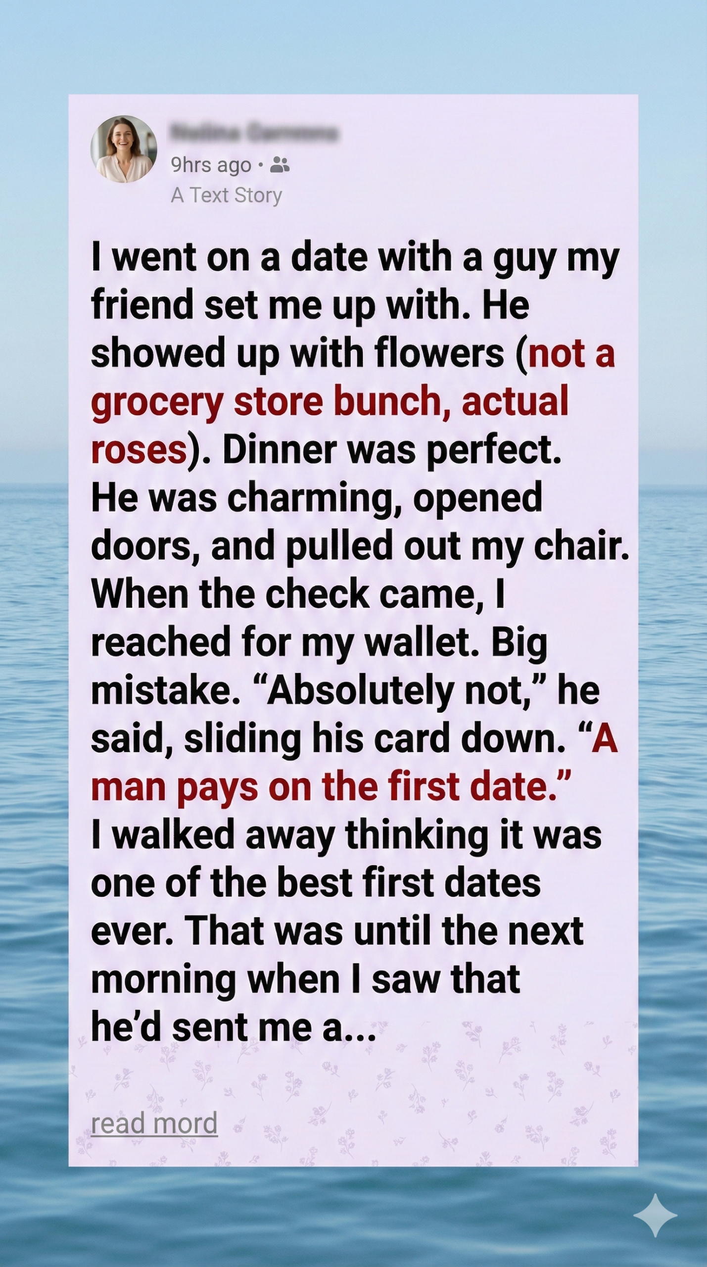 When the check arrived, Eric insisted on covering everything. “A man pays on the first date,” he said confidently. After dinner, he walked me to my car and stayed until I drove off. At that moment, the evening felt perfect.