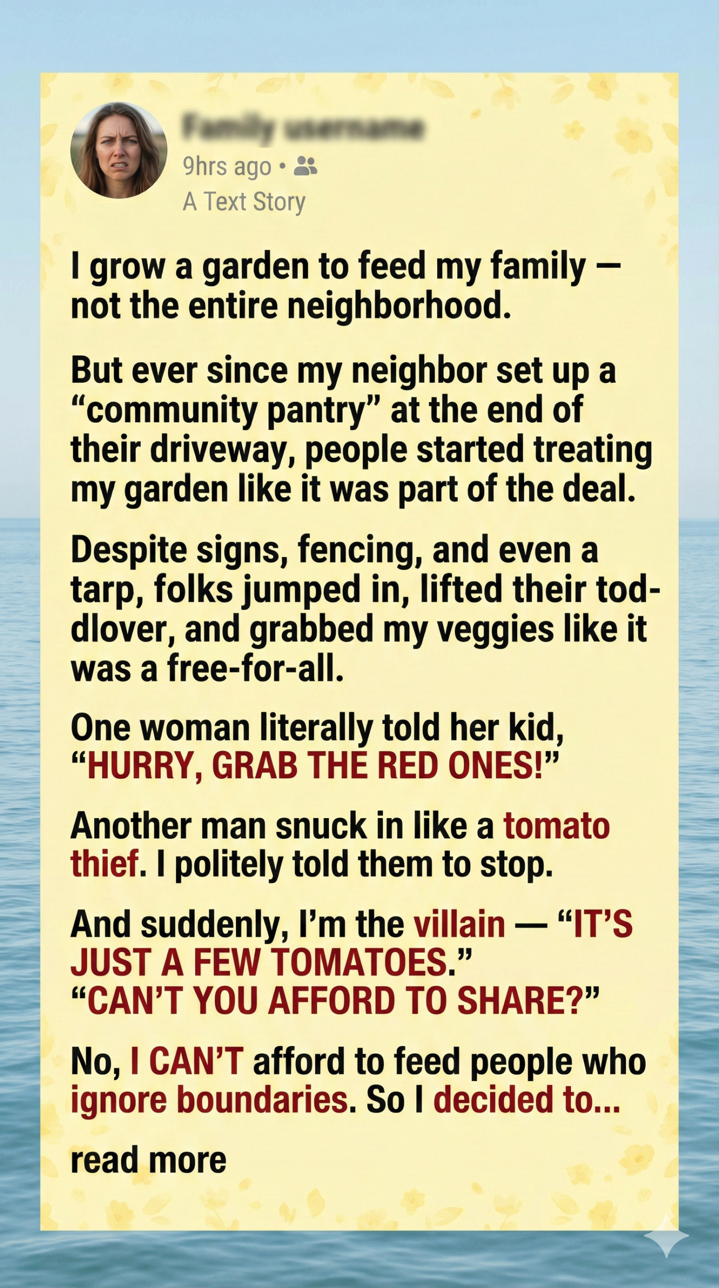Their reactions varied: some embarrassed, some annoyed, a few insisting I’d overreacted. One woman even said, “Take it as a compliment. Your tomatoes were that good.”