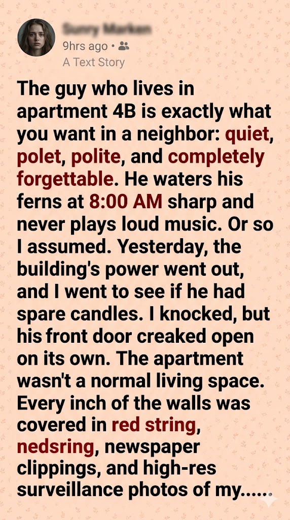 Slow, deliberate footsteps echoed on the tile outside. I killed the flashlight instantly, my heart threatening to crack my ribs as I backed into the shadows of the obsessive, terrifying labyrinth. The brass doorknob of 4B slowly began to turn.