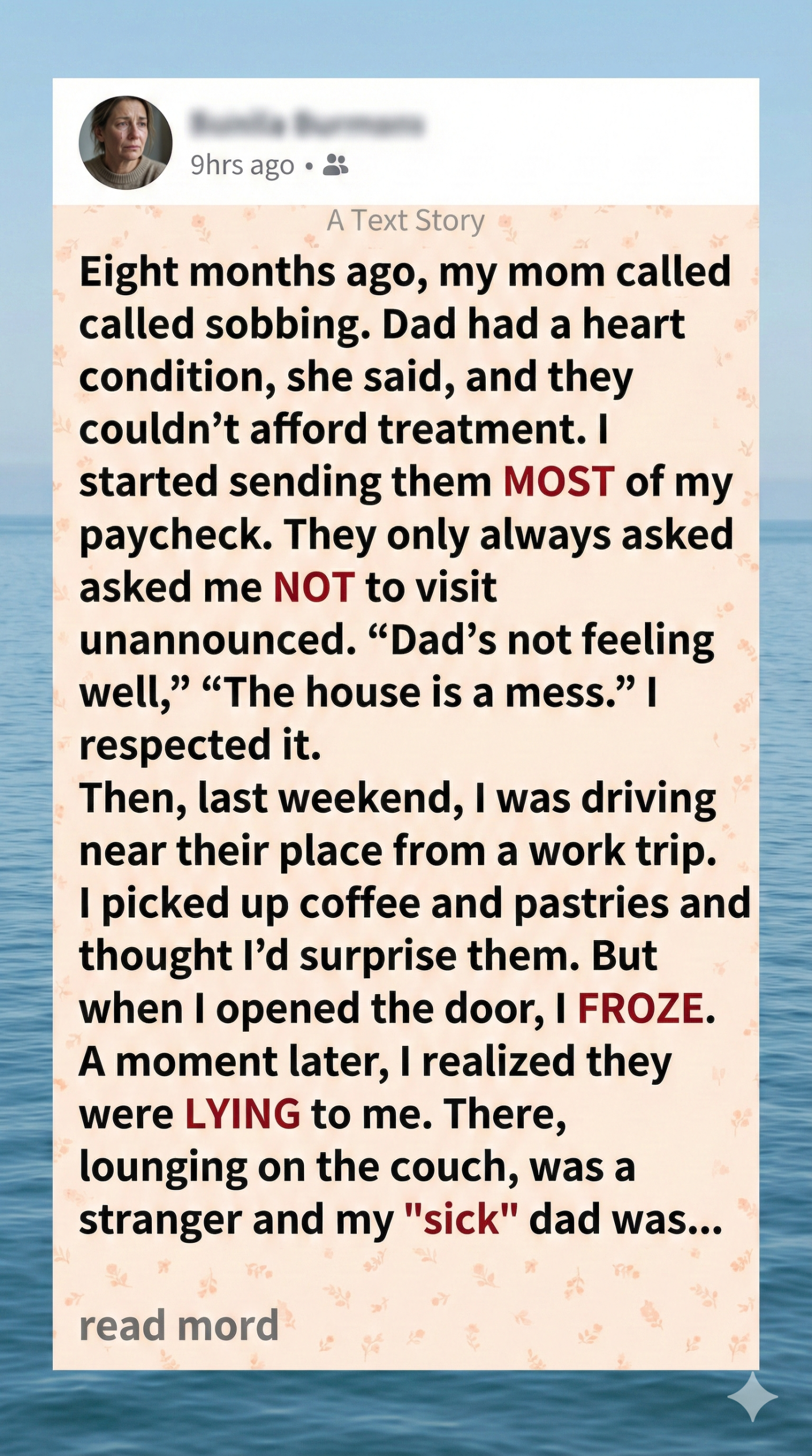 Eight months ago, my mom called, her voice a ragged whisper through sobs. Dad had a rare, terrible heart condition, she said, and they couldn’t afford the life-saving treatment. My world stopped. My heart ached for them. I didn’t hesitate. I started sending them MOST of my paycheck. Every penny I could spare, every overtime shift I could pick up, went straight to them. It was a small sacrifice, I told myself, for the people who gave me everything. They only ever asked me NOT to visit unannounced. “Dad’s not feeling well,” “The house is a mess,” “We don’t want you to see him like this.” I respected it. Maybe they just wanted to spare me the sight of his suffering. My calls were always brief, Mom reassuring me he was ‘stable’ but ‘still very weak.’ I just pictured him fading, and it broke my heart a little more each day.