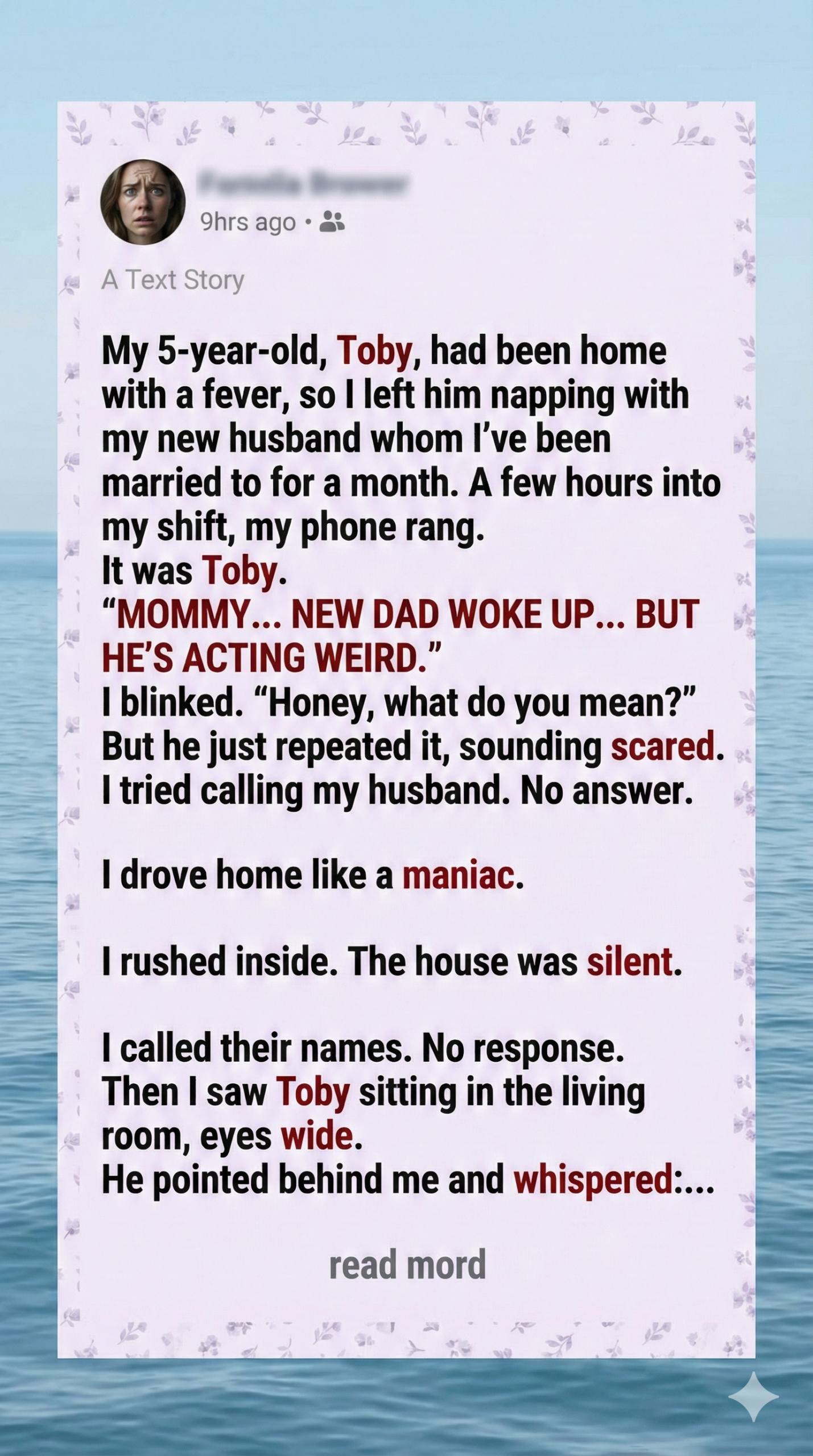 “MOMMY… NEW DAD WOKE UP… BUT HE’S ACTING WEIRD.” I blinked. “Honey, what do you mean?” But he just repeated it, sounding scared. I tried calling my husband. No answer. I drove home like a maniac. I rushed inside. The house was silent. I called their names. No response.