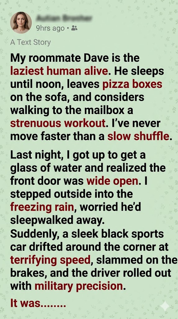 “You… you just rolled out of a moving vehicle,” I stammered, pointing a shaking finger at the empty street. “In body armor. Dave, you wouldn’t even get up to answer the door for the pizza guy yesterday!”