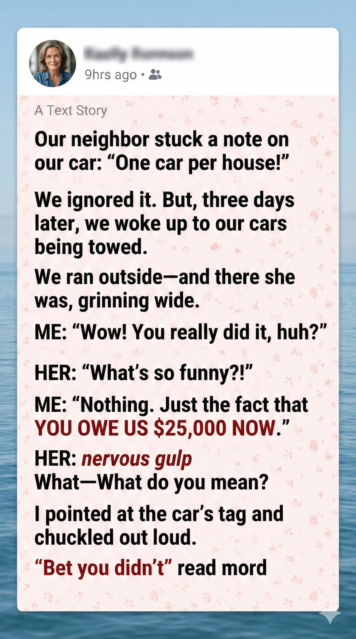 She made small talk about how orderly and peaceful the street was, then smoothly pivoted to neighborhood regulations. According to her, the HOA permitted only one vehicle per driveway—even though both of ours fit without issue. Jack questioned the logic politely, but she brushed it off with a thin smile, emphasizing that rules were rules. Once she left, we shrugged it off, joking that she took community guidelines a bit too seriously.
