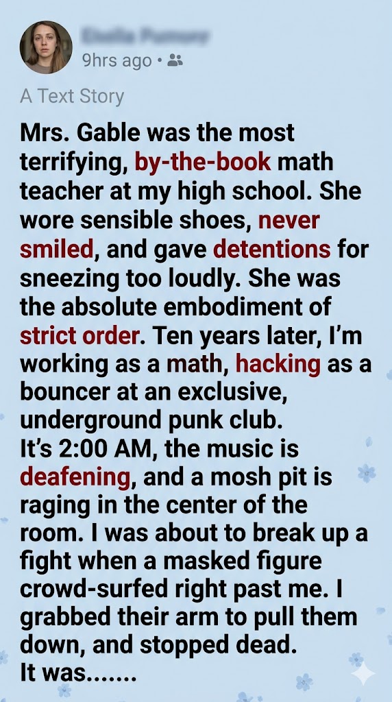 The neon skull mask she was wearing had slipped sideways, revealing those unmistakable, piercing gray eyes that had once vaporized my confidence during a pop quiz on quadratic equations.