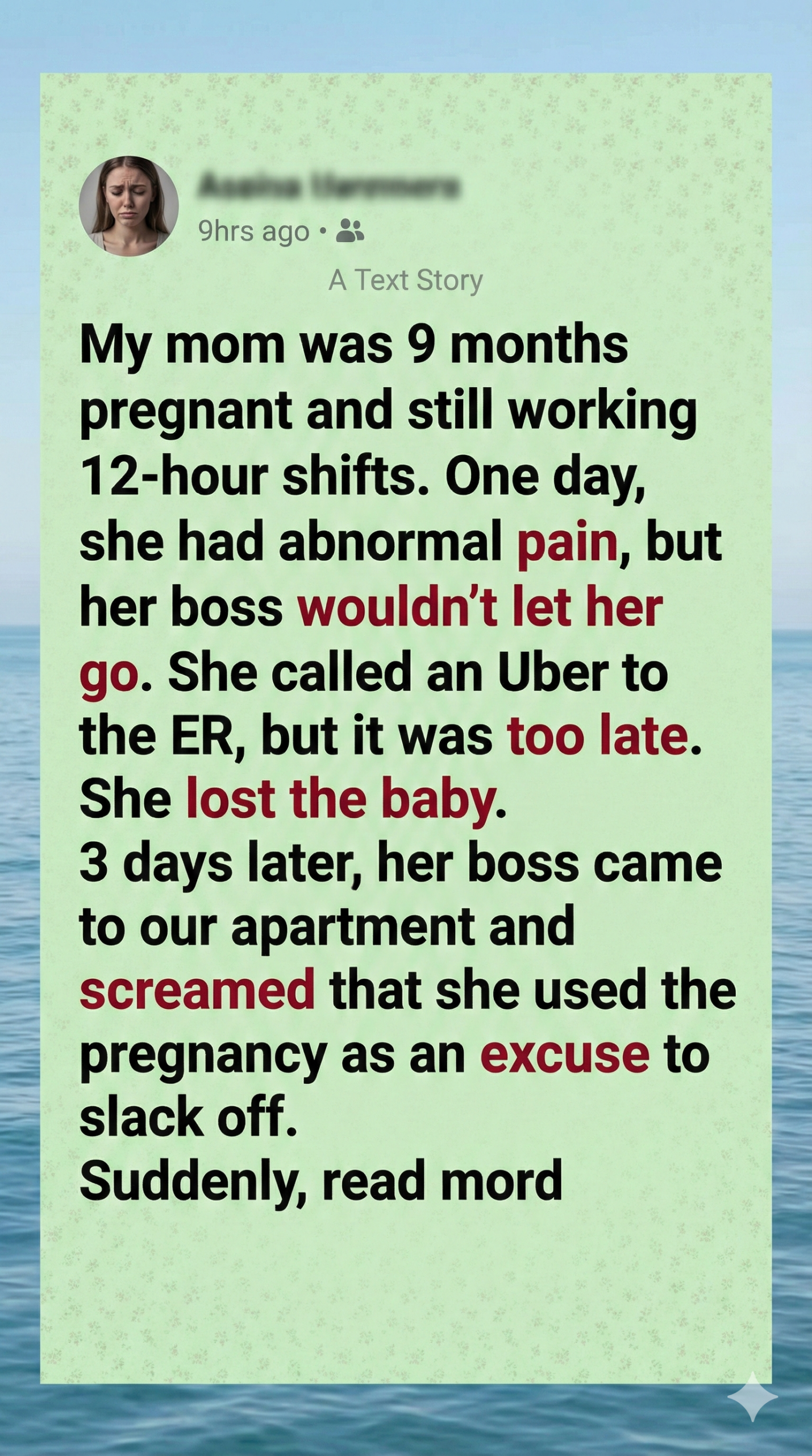 My mom was nine months pregnant and still working 12-hour shifts at a small diner on the edge of town. She was exhausted all the time, her feet swollen, her back constantly aching—but she kept going. We needed the money. My dad had passed away two years earlier, and it was just the two of us.