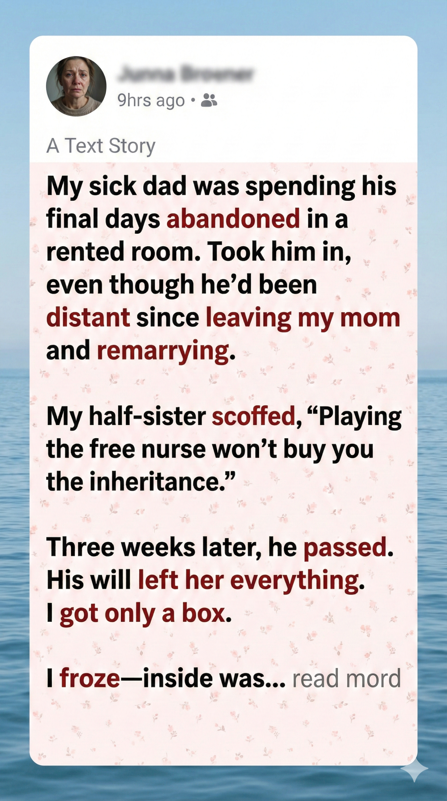I wasn’t shocked. And honestly, I wasn’t upset. I never cared about what he left behind. I only wanted him to feel less alone at the end.