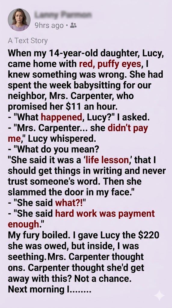Mrs. Carpenter avoided making eye contact with us for months. And funnily enough, a neatly sealed envelope containing exactly $220 in cash appeared in our mailbox the very next afternoon. I let Lucy keep it as a bonus. After all, she earned it.