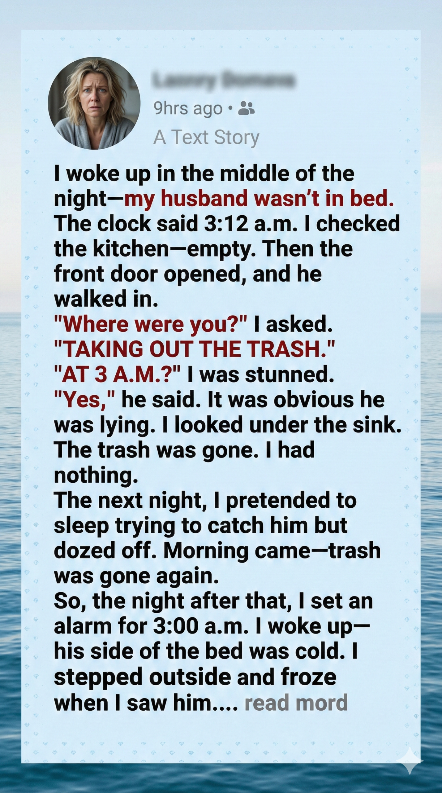 I woke up in the middle of the night — my husband was not in bed. The clock said 3:12 am I checked the kitchen — empty. Then the front door opened, and he walked in. “Where were you?” I asked. “TAKING OUT THE TRASH.” “AT 3 AM?” I was stunned. “Yes,” he said.