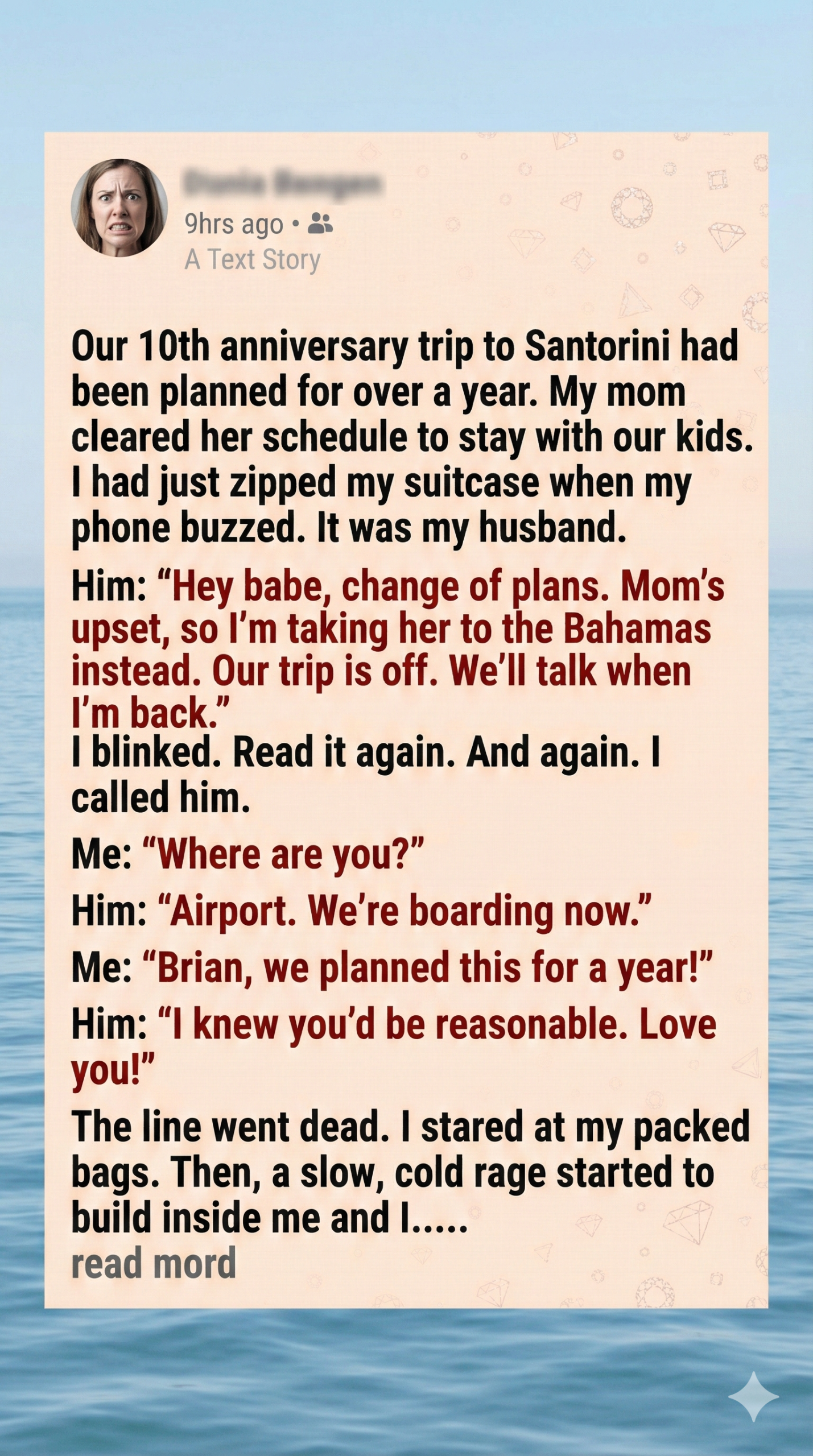 I was supposed to be sipping wine in Santorini with my husband, celebrating a decade of marriage. Instead, he canceled our trip last-minute… to take his mother on vacation. He thought I’d stay home, hurt and waiting. But I did something that left him speechless and scrambling to explain himself.