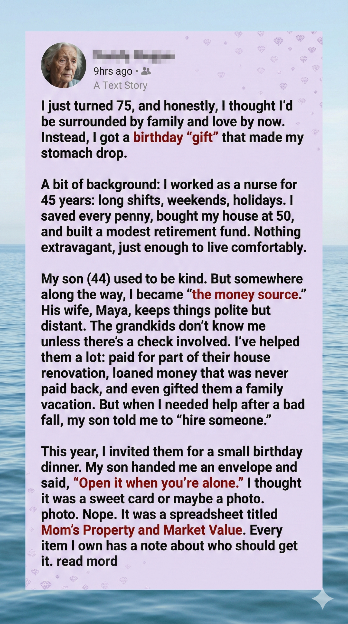 The birthday celebration itself was relatively quiet but incredibly revealing. While her younger son and his family gave her a genuinely touching and beautiful necklace, her older son and DIL presented her with a large envelope. Gloria initially smiled, expecting a heartfelt card, but was immediately stunned and frozen when she opened the envelope to find a stack of their outstanding personal bills.