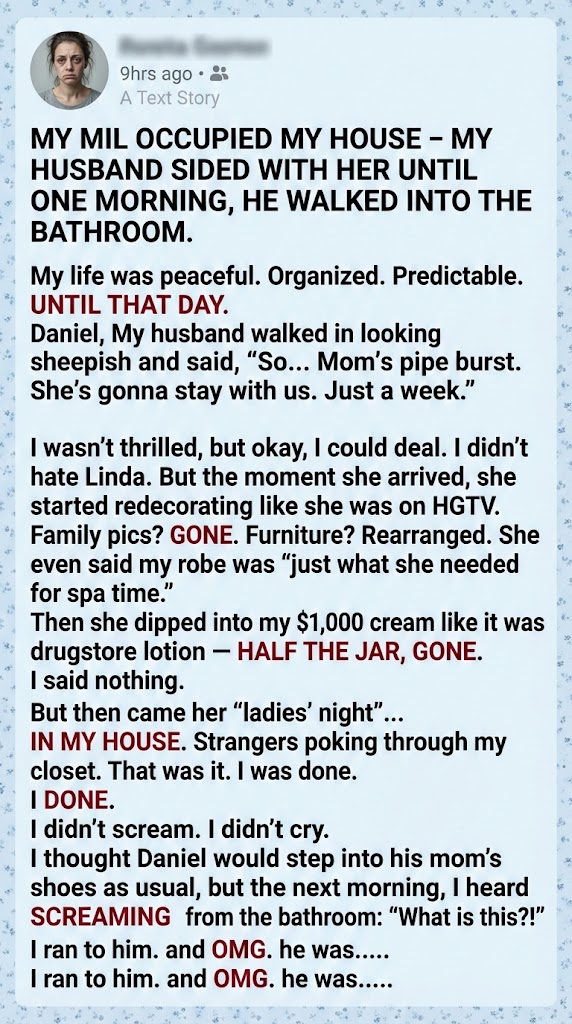 “Well, don’t look at me like that!” Linda scoffed, clutching her pearls. “I was organizing! This house was a mess before I got here. You should be thanking me for decluttering that shower caddy!”