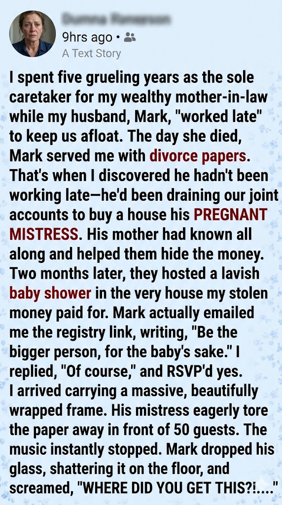 You see, my mother-in-law was a bitter, cruel woman who gladly helped Mark hide the money to get rid of me. But as her health rapidly deteriorated in those final months, Mark was too busy playing house with Chloe to visit her. I was the only one there. I was the one changing her bedpans, administering her morphine, and listening to her final complaints. In a final, spiteful act of revenge against the son who abandoned her to die, she flipped the script.