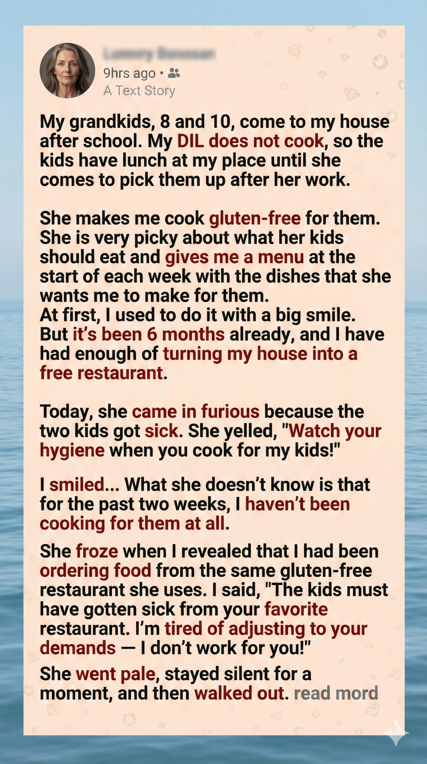 Then came the breaking point. She stormed into my kitchen, furious that the kids had gotten sick, and accused me of poor hygiene. I didn’t flinch. Calmly, I revealed that I hadn’t cooked for two weeks—I’d been ordering from her favorite gluten-free restaurant. Her face drained of color. I told her, “I’m tired of adjusting to your demands. I don’t work for you.” She left in silence. That night, my son called to scold me, saying I had nothing better to do than cook for my grandkids. His words cut deeper than hers.