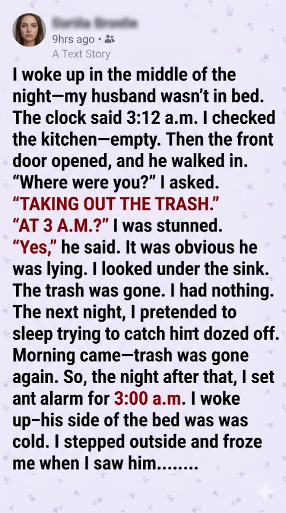 After 22 years of marriage, my husband suddenly started taking the trash out at 3 a.m. He’d never volunteered for it… not once. So why now? One night, I followed him and what I discovered broke my heart in ways I wasn’t ready for.