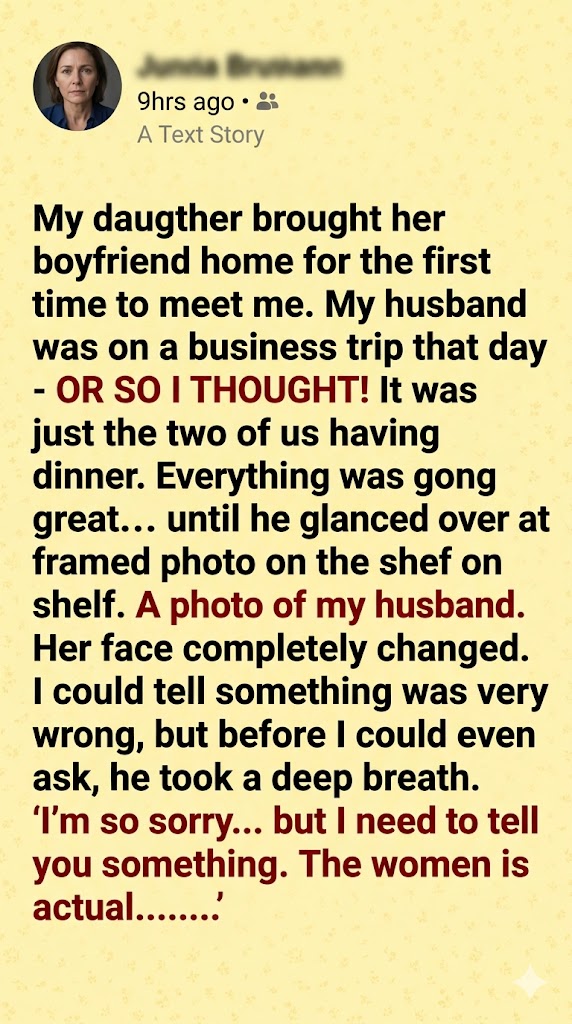 My daughter brought her boyfriend home for the first time to meet me. My husband was on a business trip that day—OR SO I THOUGHT! It was just the three of us having dinner. Everything was going great… until he glanced over at a framed photo on the shelf. A photo of my husband.