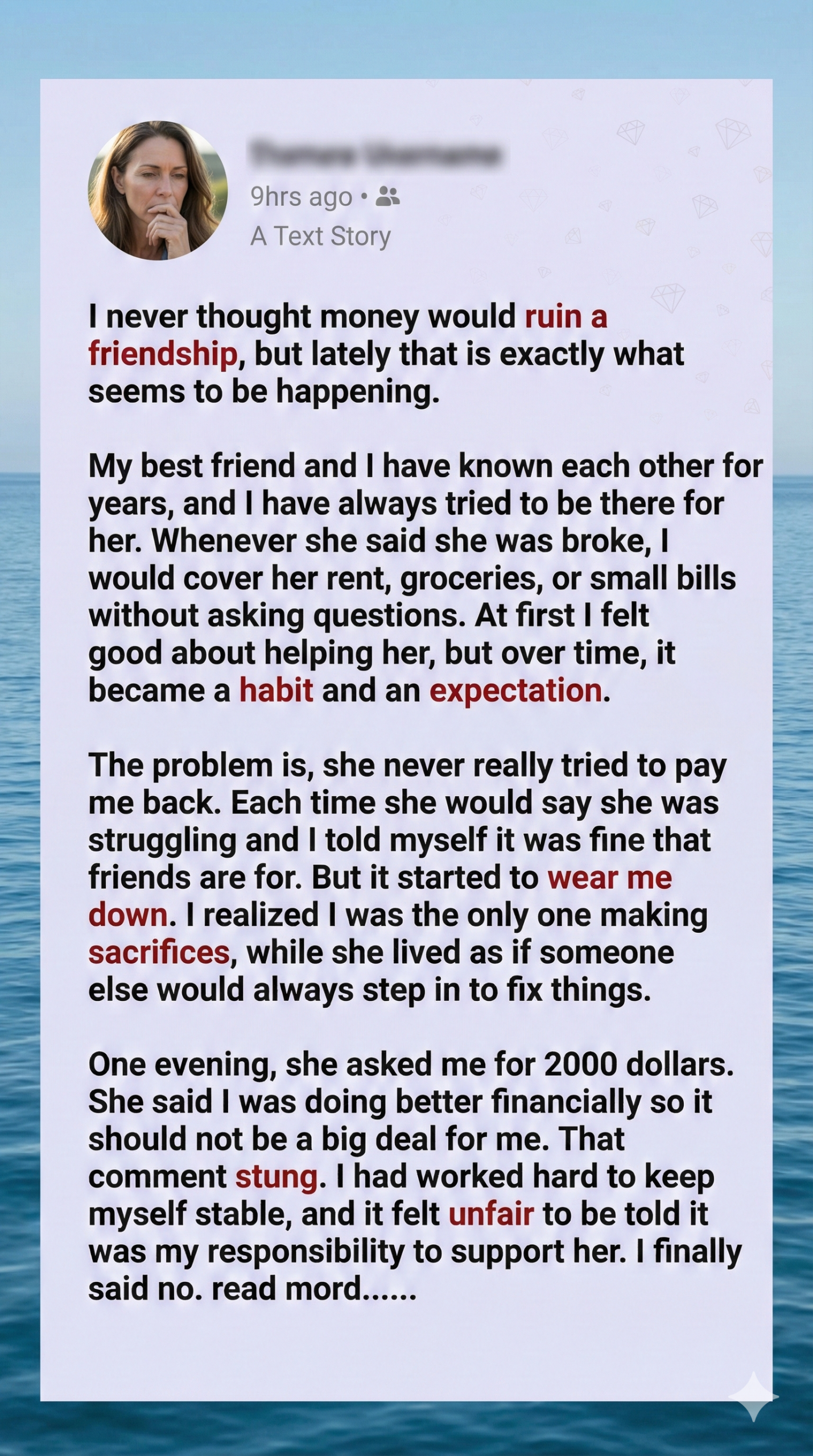 I used to believe that helping a friend in need was the highest form of loyalty. For years, I supported my best friend financially—covering her rent, groceries, and bills without hesitation. She never paid me back, but I told myself that’s what friends do. The problem was, she stopped even pretending to try. It became routine: she’d cry broke, and I’d fix it. I worked hard to stay afloat, while she floated on my generosity. I didn’t realize I was being used until the day she asked for $2,000 and said, “You’re doing better, so it shouldn’t be a big deal.”