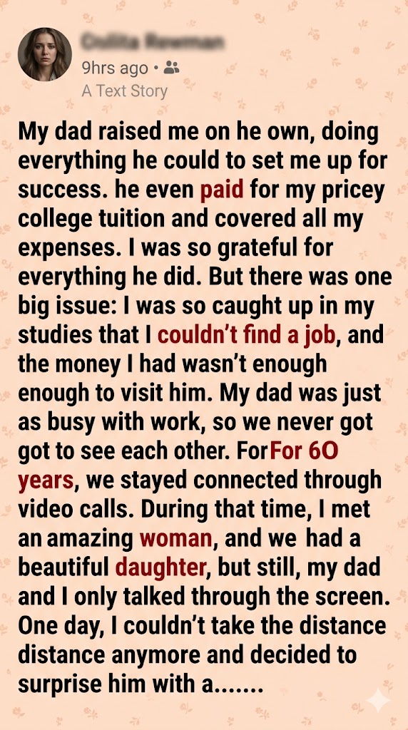 My dad raised me on his own, doing everything he could to set me up for success. He even paid for my pricey college tuition and covered all my expenses. I was so grateful for everything he did. But there was one big issue: I was so caught up in my studies that I couldn’t find a job, and the money I had wasn’t enough to visit him. My dad was just as busy with work, so we never got to see each other. For 6 years, we stayed connected through video calls. During that time, I met an amazing woman, and we had a beautiful daughter, but still, my dad and I only talked through the screen. One day, I couldn’t take the distance anymore and decided to surprise him with a visit, bringing my wife and his two-year-old granddaughter along.