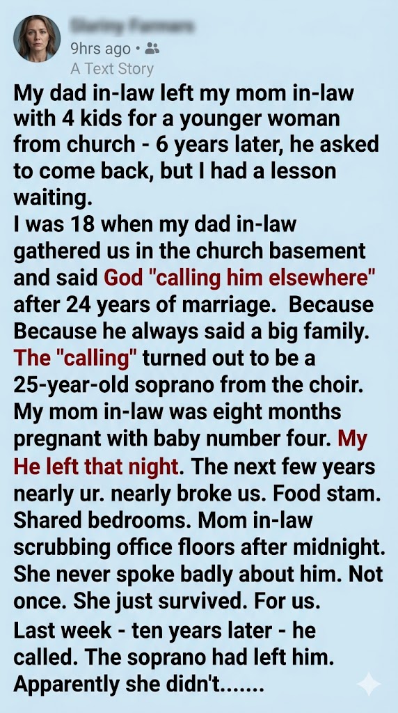 Now, he wanted to come back. He called my husband, Caleb, crying on the phone about “mistakes,” “redemption,” and “God’s true plan.” He asked to come over for Sunday dinner to see the family, especially my mother-in-law, Lorraine. He just assumed the woman he abandoned would blindly welcome him back because of her forgiving nature.