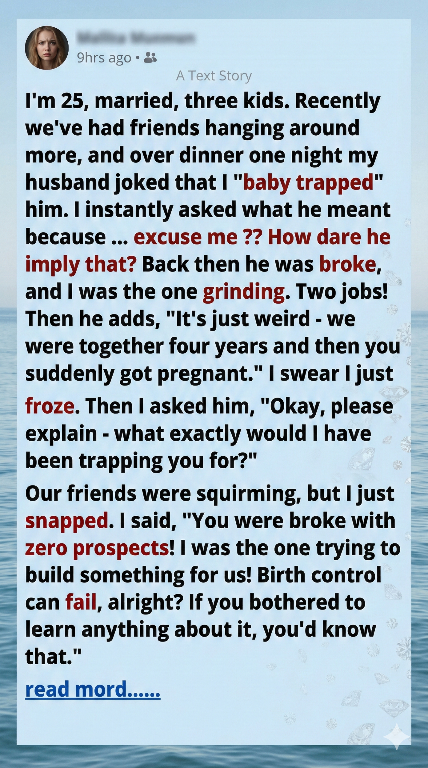 Fast forward to the present: I’m twenty-five, married, and a mother of three. We’ve been spending more time with friends lately, enjoying dinner parties and casual gatherings. It was at one such dinner that my husband decided to make a joke that cut far deeper than he intended. Right in front of our guests, he laughed and said I had “baby trapped” him with our first child. I immediately froze and asked, with a rising sense of disbelief, exactly what he meant by such a cruel implication.