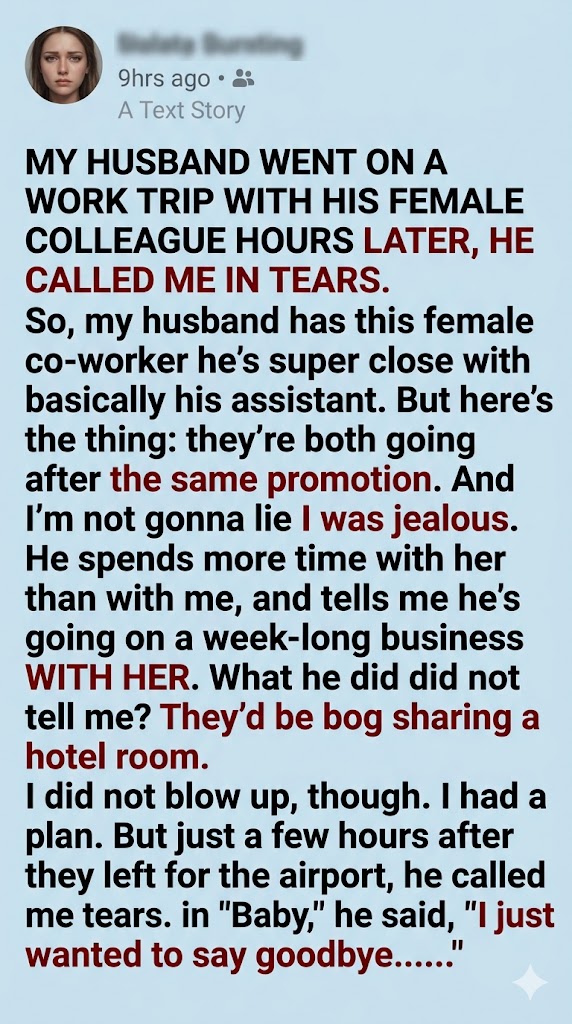 So, my husband has this female co-worker he’s super close with—basically his assistant. But here’s the thing: they’re both going after the same promotion. And I’m not gonna lie, I was jealous. He spends more time with her than with me, and tells me he’s going on a week-long business trip WITH HER. What he didn’t tell me? They’d be sharing a hotel room. I didn’t blow up, though. I had a plan. But just a few hours after they left for the airport, he called me in tears.